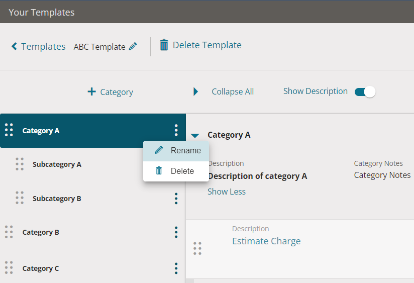 to rename or delete the category. - To edit the name of the Template category or sub category, click Rename.