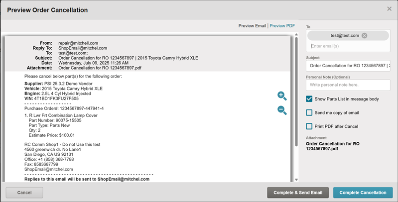 - Complete & Send Email: Cancel the order by email and send to additional recipients.