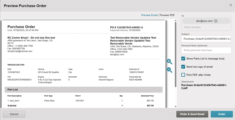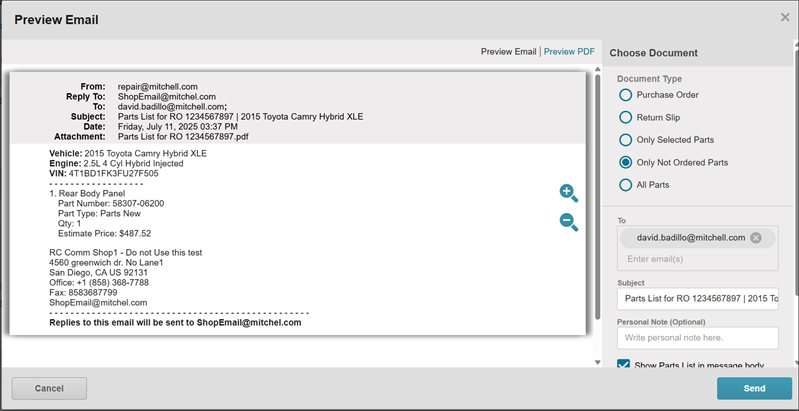 Generate a parts list document after you complete your estimate. The parts list document includes part descriptions, quantity, and estimated prices from your estimate. You can email the parts list as an order directly from Mitchell Cloud Estimating. You can also print the parts list document or save it to your computer for reference.