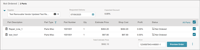 in the Requested Delivery field to select a new date. - All the parts listed are selected by default. Clear the check boxes next to any parts you do not want to order.