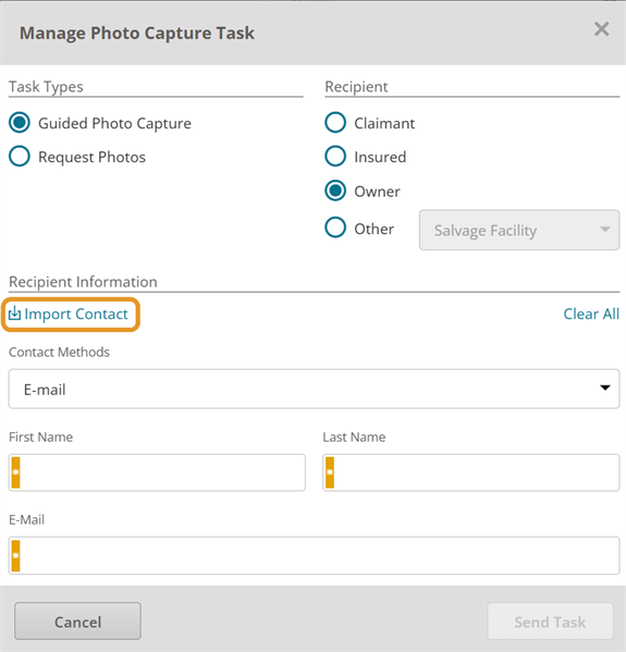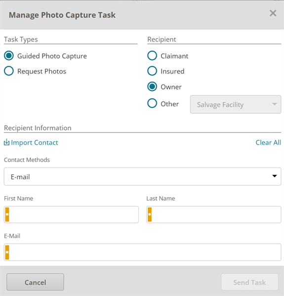 Tip: Select Clear All if you need to clear and reset recipient information fields on the Manage Photo Capture Task window. If you select Request Photos task type, the Notes box is also cleared.