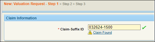 In the Claim Information section, enter the Claim-Suffix ID for the new valuation request.