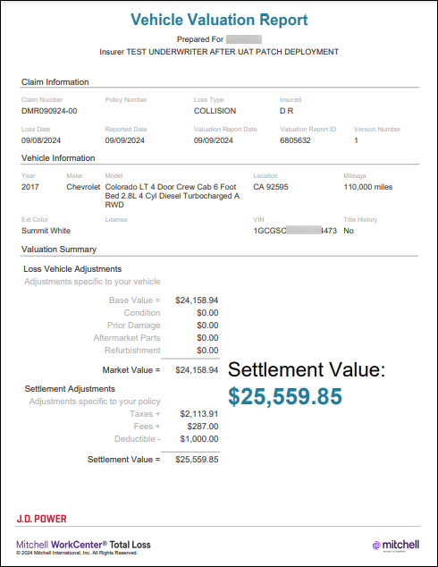 The report provides the base value and market value of the total loss vehicle, with adjustments for condition, prior damage, equipment, etc. You can view the Vehicle Valuation on-screen in both Detail and Document views.
