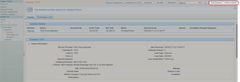 - Select Print Preview to view a preview of the estimate with all information, including Admin Information.
