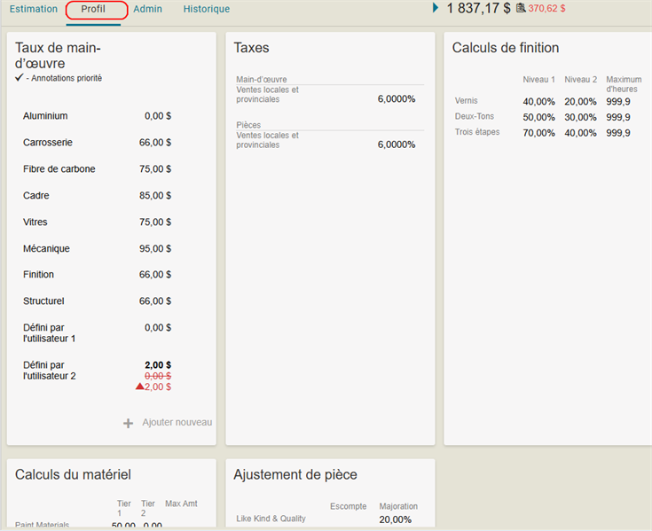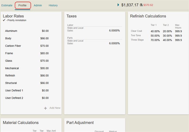 The Estimate Profile tab shows information on an estimate's taxes, refinish and material calculations, labor rates, and part adjustments. Taxes and Refinish Calculations for an estimate are static, while the Labor Rates and Parts Adjustment can be edited.