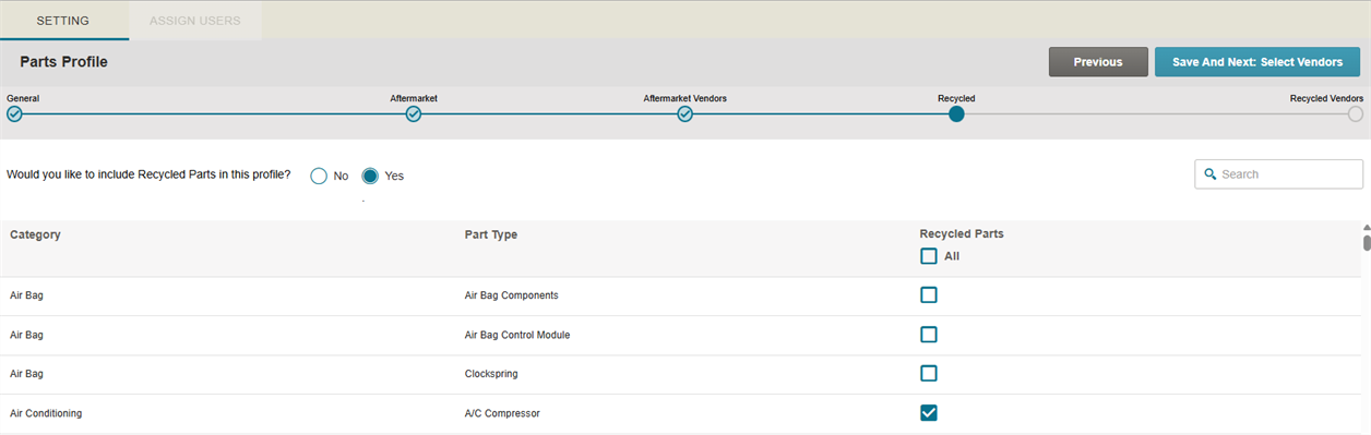 Note: You must select at least one vendor from either the aftermarket or recycled parts vendors to use aftermarket or recycled parts in your estimates.