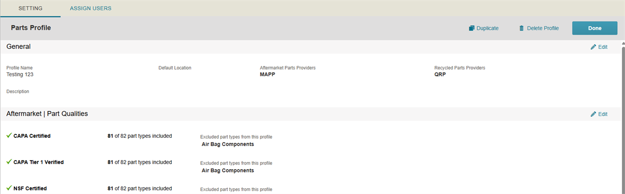 - Find and select users to assign to the profile. See Assign Users to a Parts Profile for more information.