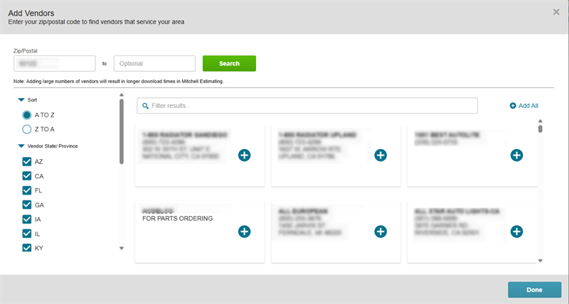 Note: Adding a large list of vendors to your profile may cause delays when downloading the profile in Mitchell Cloud Estimating.