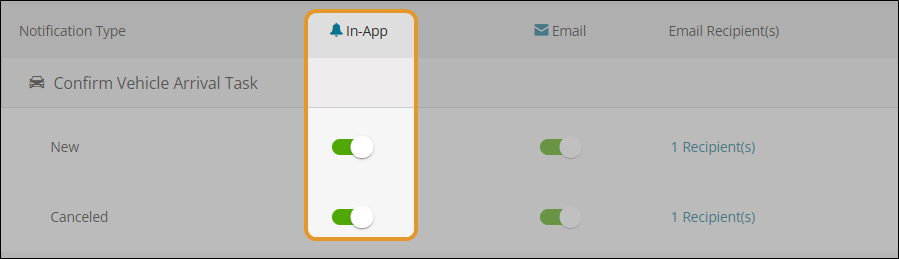 - In the In-App column, turn on or turn off the toggle  next to the notification type: next to the notification type: