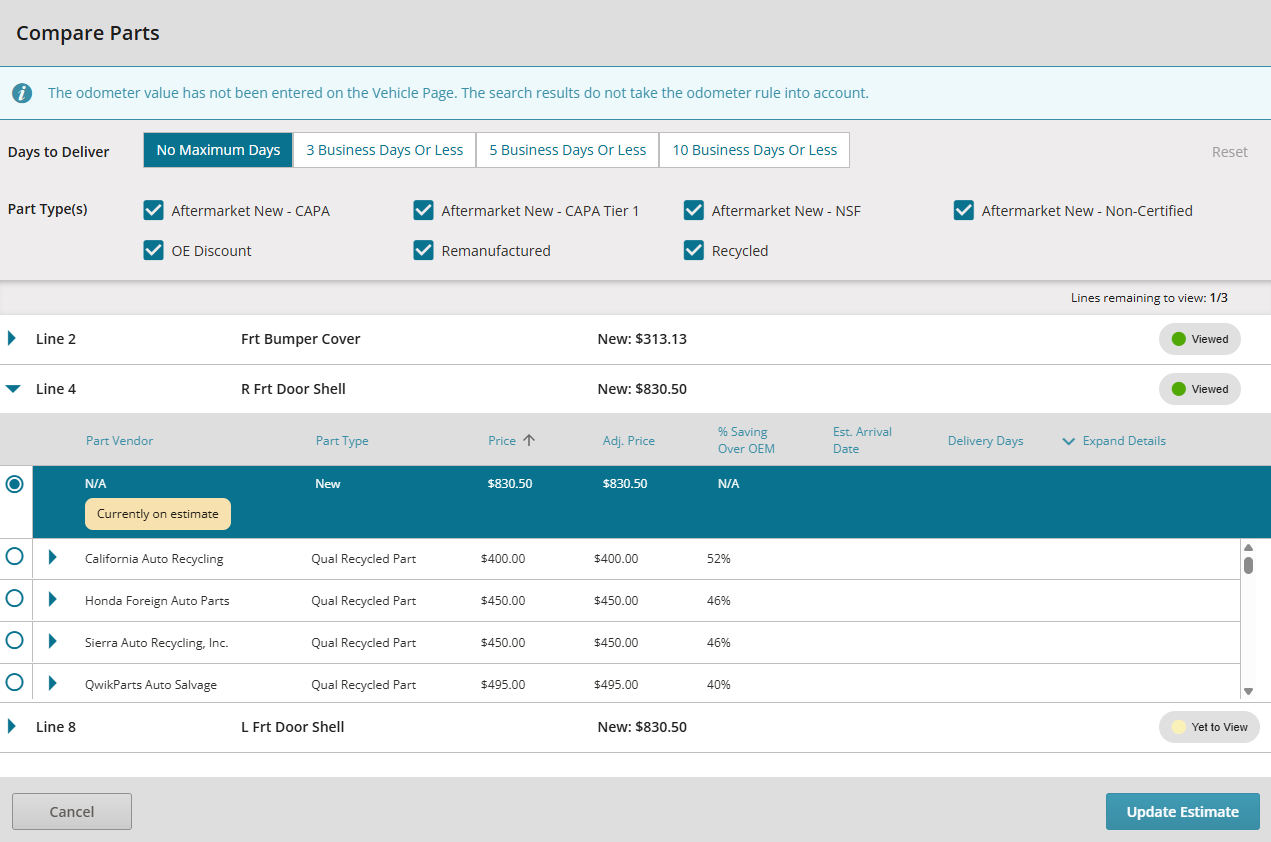 If you are an Alternate Part Profile user, you can write an estimate with alternate parts in Mitchell Cloud Estimating. Compare alternate part profiles and their options (including aftermarket or recycled parts) using the Compare Alternate Parts window.