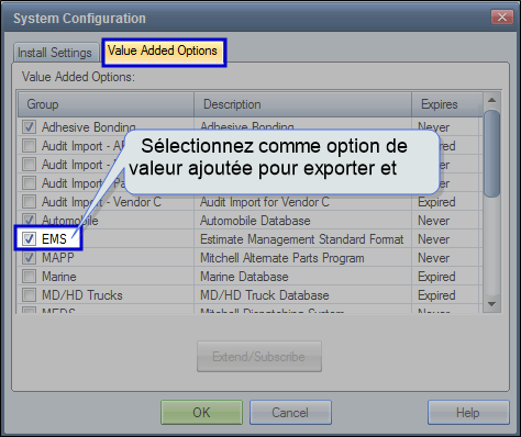 - Next, select EMS as a Mitchell Value Added Option (VAO) to enable EMS export of estimates.