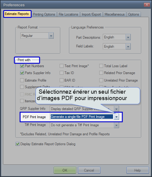 On the Estimate Reports tab, under Print with, click the PDF Print Image arrow, and then click Generate a single file PDF Print Image.