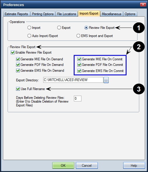 Set your Export Directory to C:\MITCHELL\ACES\REVIEW.