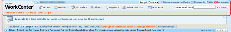 The navigation bar provides access to various features based on the modules in WorkCenter, such as Search, Work Queue, and Reports. Hover over the window component name to see the menu of available options and select the option you want.