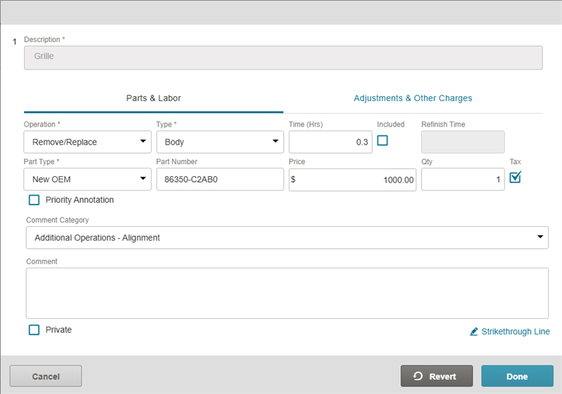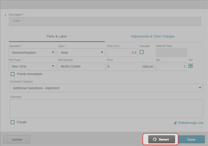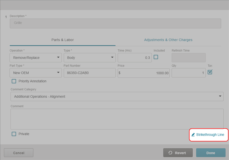 Strike through a repair line to remove it from the review. Any lines you strike through will be sent to Mitchell Cloud Estimating as a Review Annotation line that can be accepted or rejected.