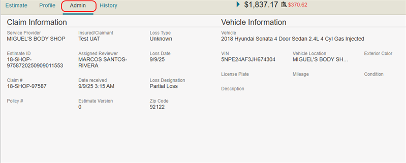 The Admin Tab shows the claim and vehicle information for the estimate. The claim and vehicle information are found in the Job Overview in Mitchell Connect.