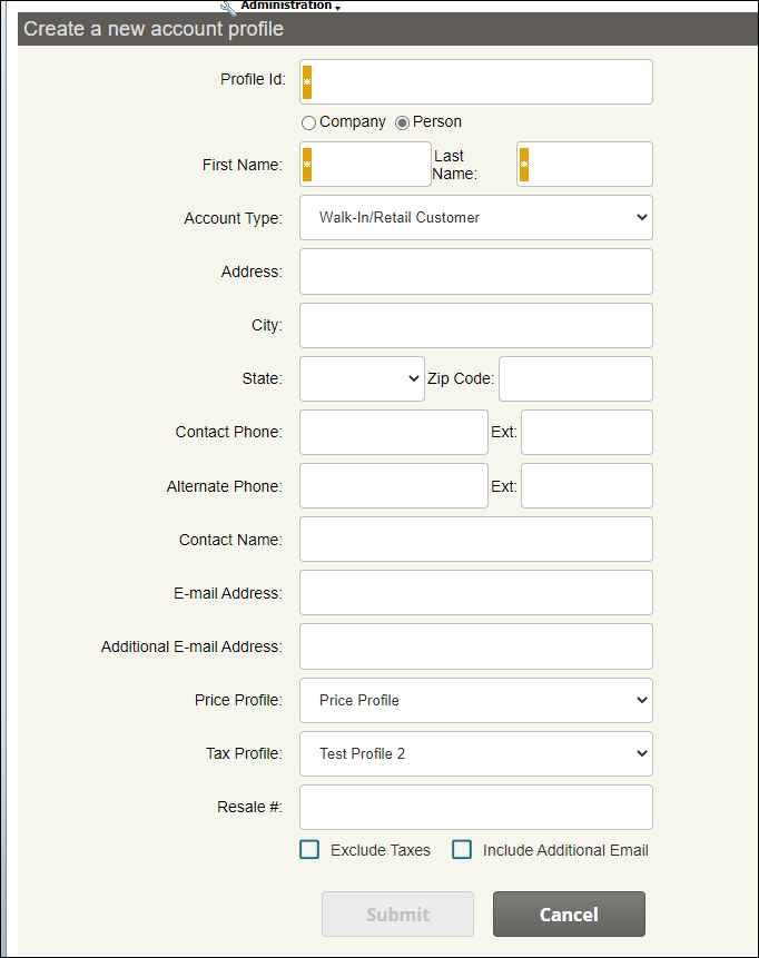 Enter an Account ID and the name of the Company or Person associated with this profile.