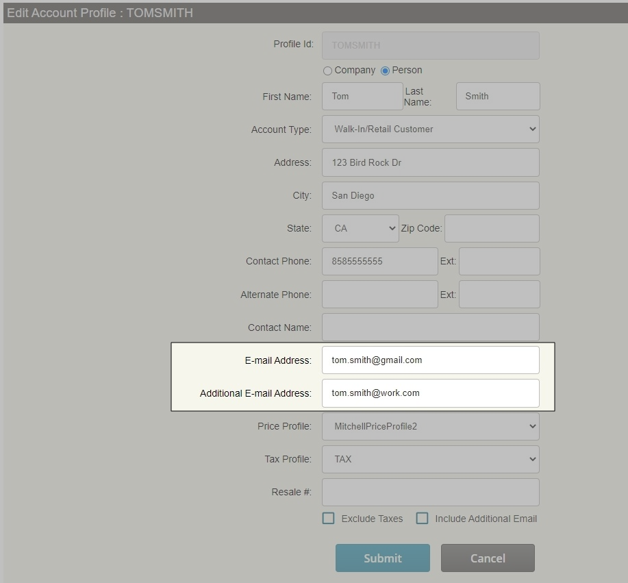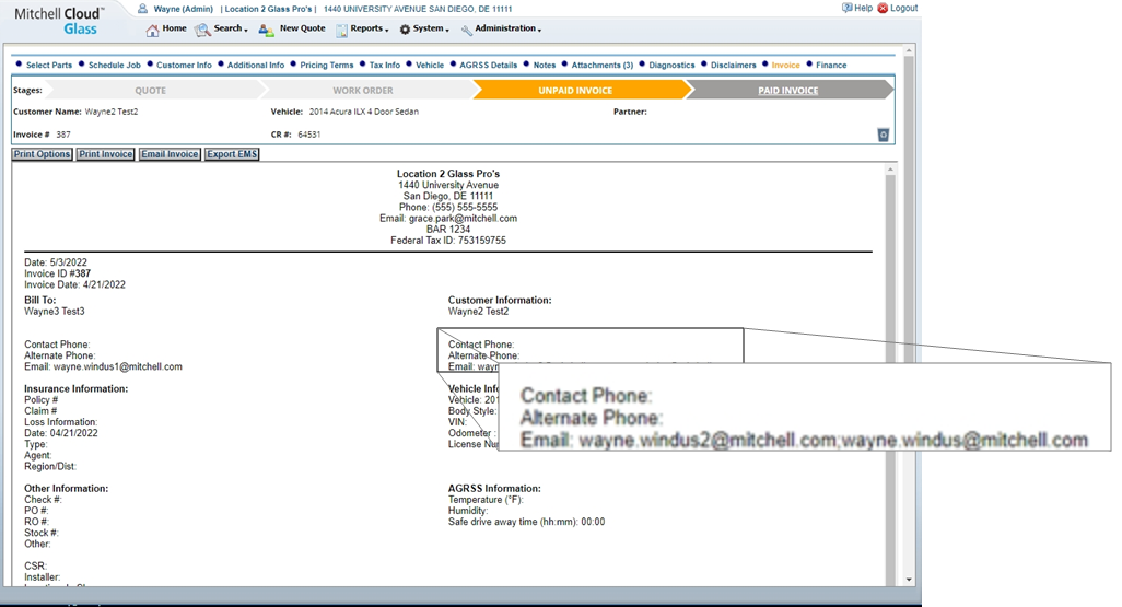 NOTE: Both email addresses will show on the invoice. If you email the invoice, both email recipients receive a copy of the invoice in PDF format.